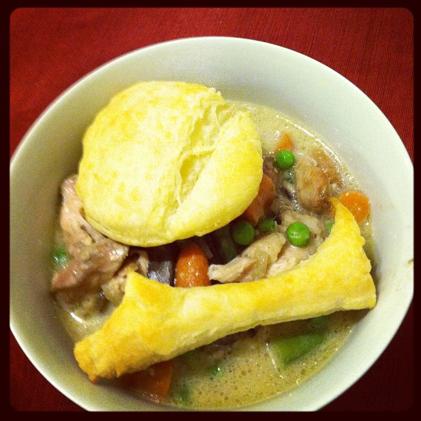 The finished potpie dish! My version ended up a bit more soup-looking then cream-looking. I also was a bit off in my measurements of the puff pastry (but puff pasty always tastes delicious).