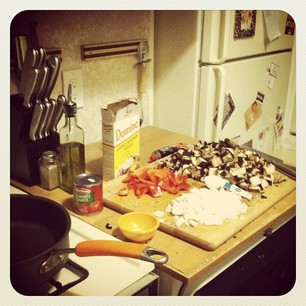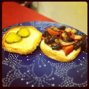 Another Sunday, another Rachael Ray meal. Tonight I made one that I haven’t made in about two years, vegetarian sloppy joes! The meat in the Joe is replaced with portabella mushrooms and red bell peppers. They make a great meat substitute. The mushrooms are hearty but not too heavy and greasy.