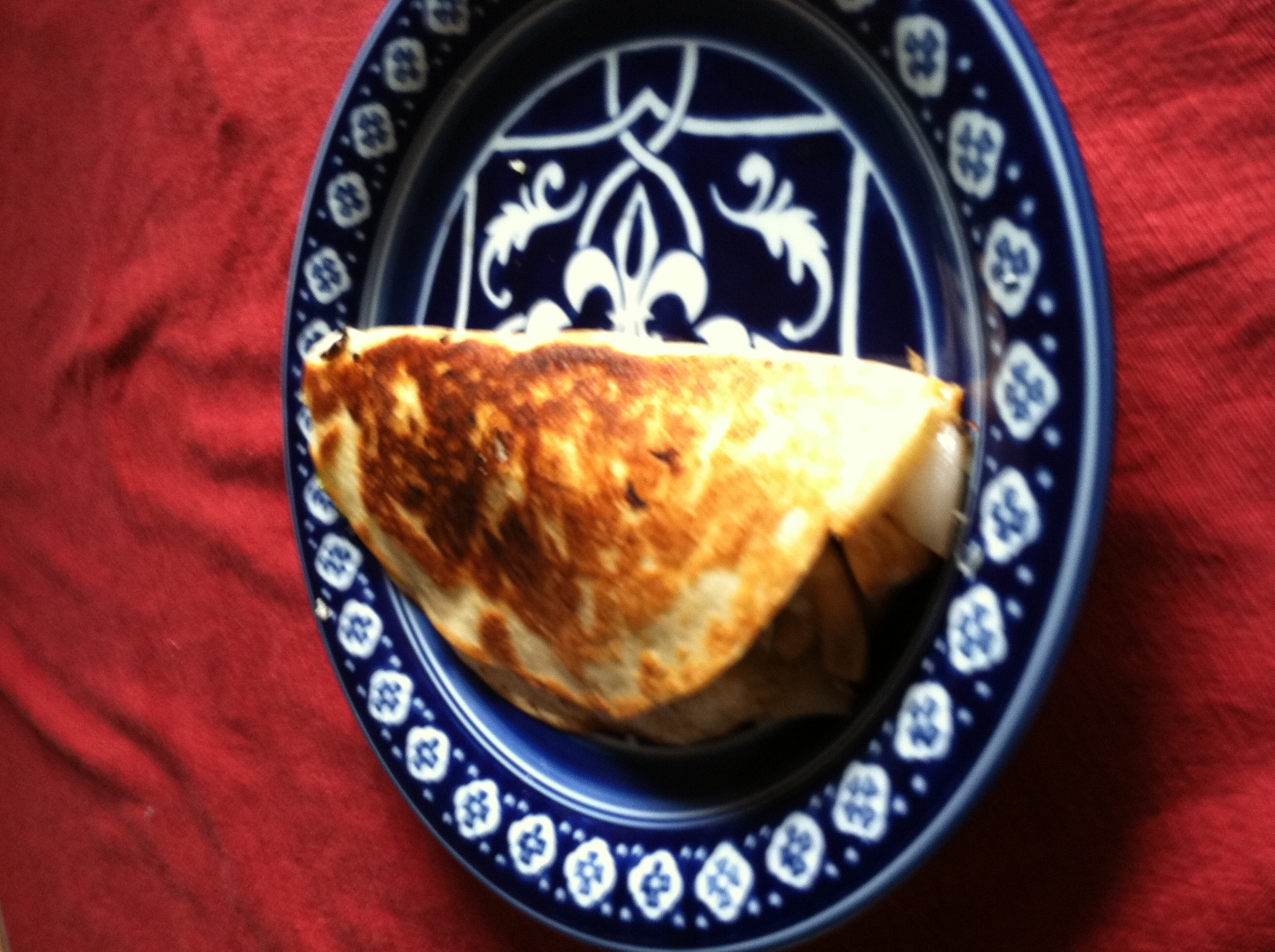 The “burrito” sized tortillas that I found at the supermarket were just the right size, my roommate and I each got one super filling quesadilla. In regards to the actual cooking, I personally like to double the amount of ingredients in the mushroom mix to have more filling. A precooked chicken would also be a way to make this recipe faster. I just grilled up some chicken on my little grill and shredded it with two forks. The tricky part of these is making sure that the insides don’t fall out into the pan while you are making the tortilla all crispy and quesadilla-like. I don’t really have an answer for how to fix that except go slowly and carefully. Also, watch the temperature of the pan, I burned mine a bit.