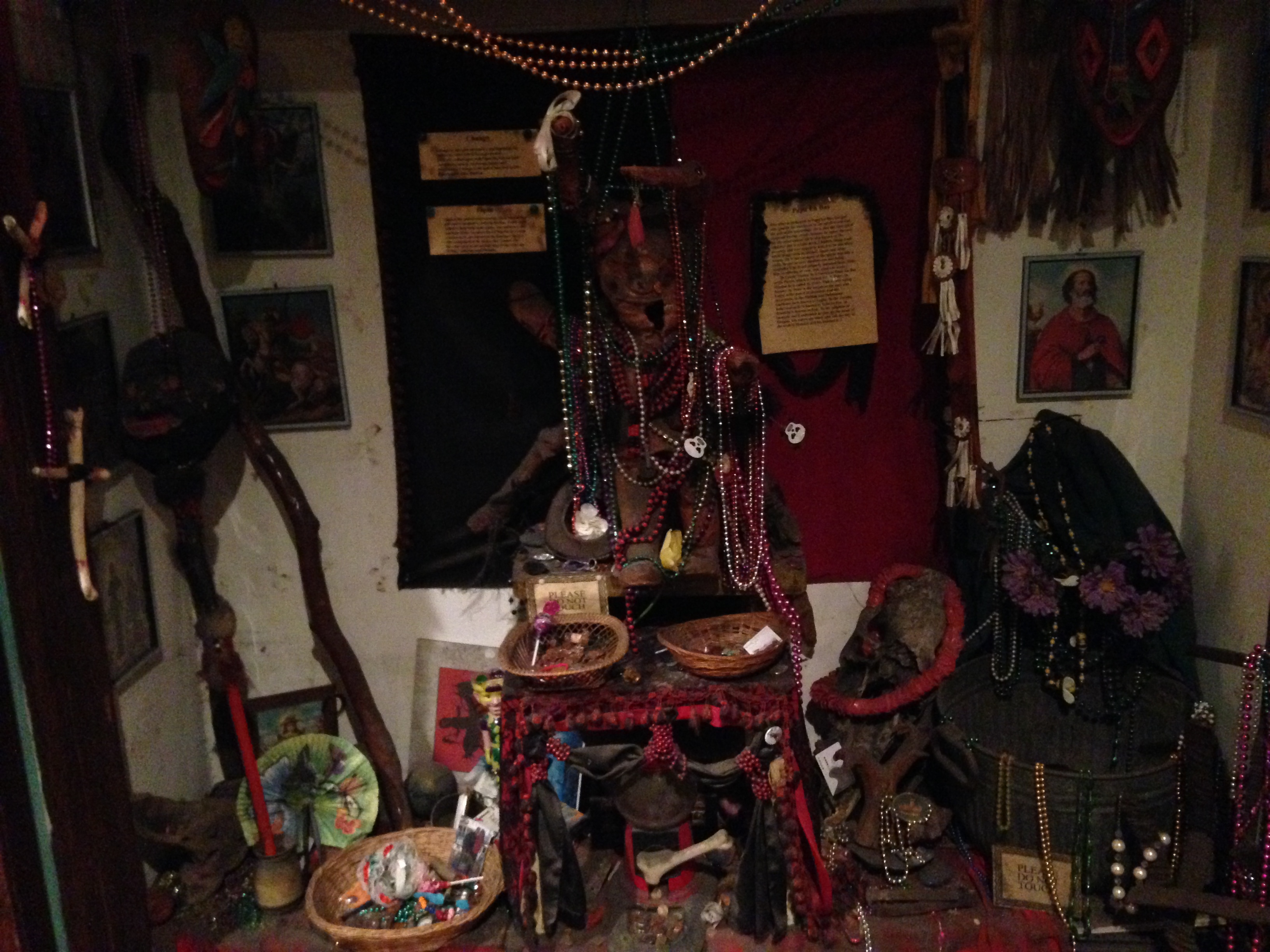 A full length shot of an alter. Notice the influence of several different religions and countries. You can also see offerings that people have left from beads to candy to coins. The Voodoo Museum is small and eerie, dimly lit with haunting music piped in. Despite its size, I really think that you get a great overview, and almost sneak peek into, of Voodoo practice and culture in New Orleans.