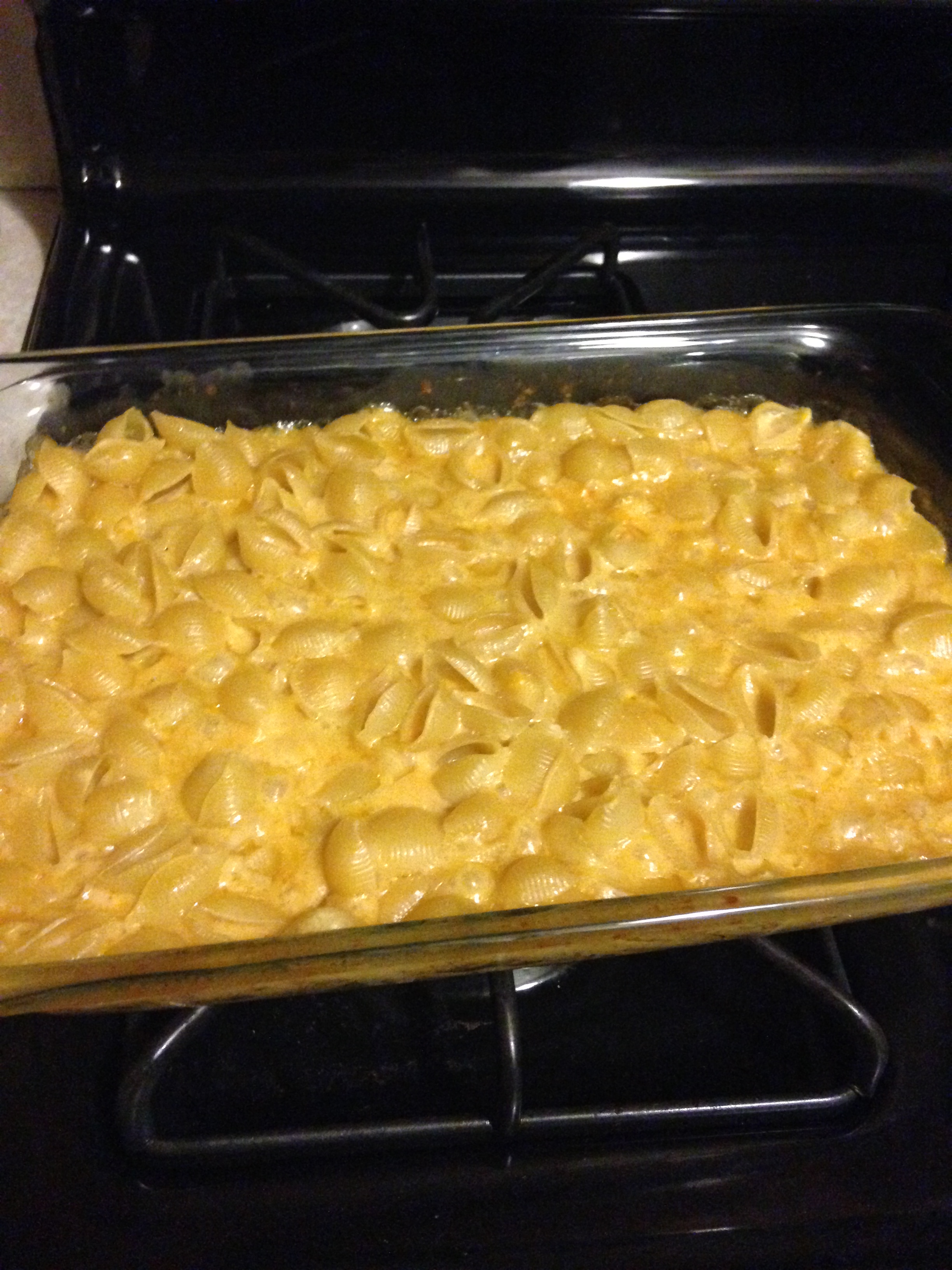 Here is my cheese sauce. It was a bit darker in the pot. This was an incredibly easy cheese sauce to make. The recipe does warn that it won’t thicken like a regular cheese sauce, and it was correct. It is going to bake with the pasta for another 30 minutes (so be sure your pasta is also super a la dente), so it will thicken and adhere and do that mac n cheese sort of thing in the oven.