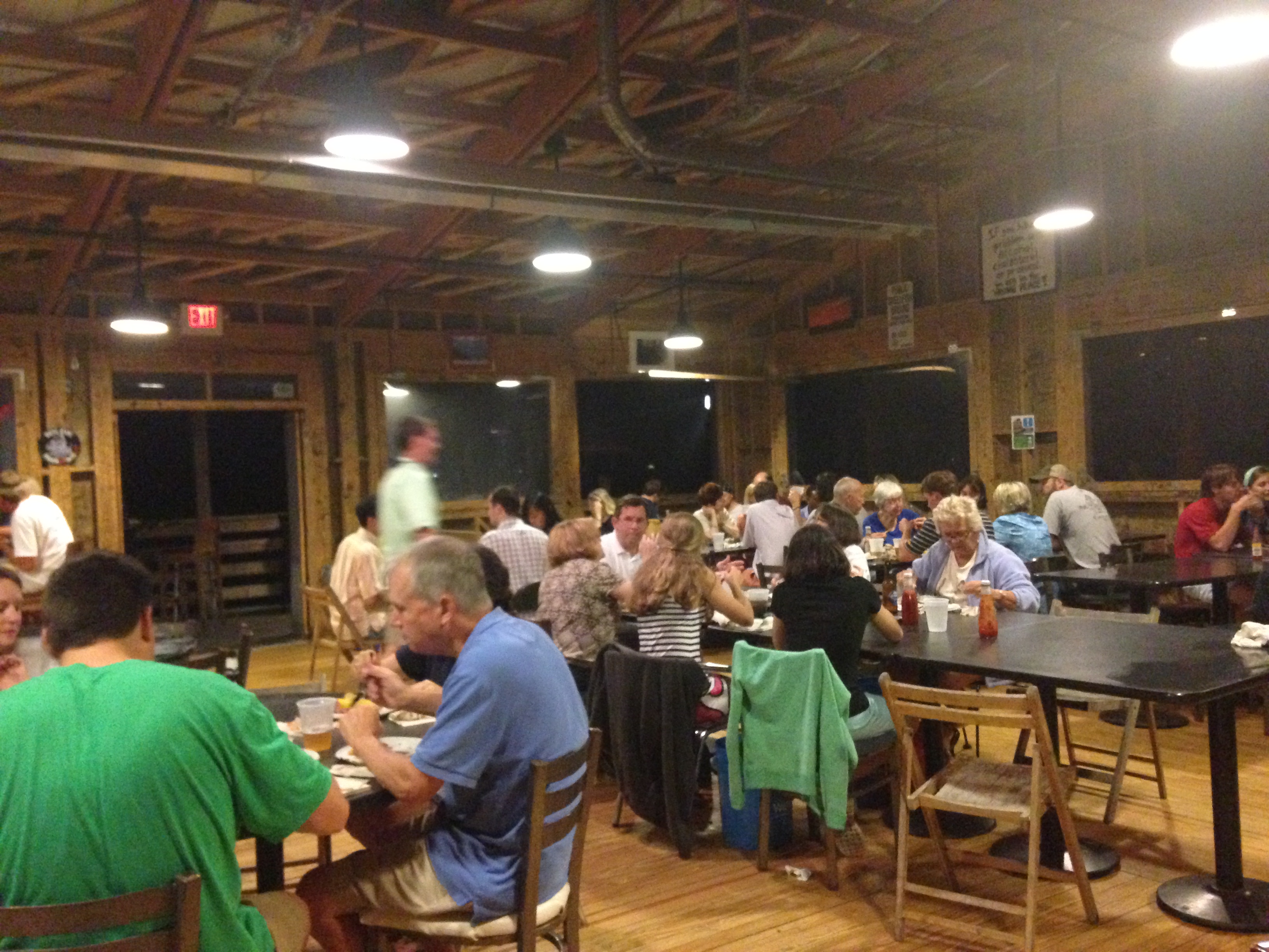 After a fantastic weekend in Charleston, I am back in New York but have to share all of my foodie adventures! In addition to soul/low country food, seafood is another specialty. I had a lot of fun Friday night venturing out to Bowen Island (yes, an actually marshy island) near downtown Charleston. What used to be a little shack near the water is now a formidable two story wooden shack. I wish had gotten a picture of the “oyster bar” area downstairs but that was basically plywood tables with holes in the middle (for your oyster shells) and little else. Upstairs, long tables line the wooden hall. You order from the bar, very little frills here. The best deal is the oyster plate, which is a entire tray of boiled oysters. There is also an all-you-can eat option for the very hungry or those feeling challenge. Other food option included a variety of fried and fresh seafood. All of the beers on tap were local brews, and the bartender was very knowledgeable about them, asking what brands we would normally pick to find the best beer. I went with a hoppy IPA.