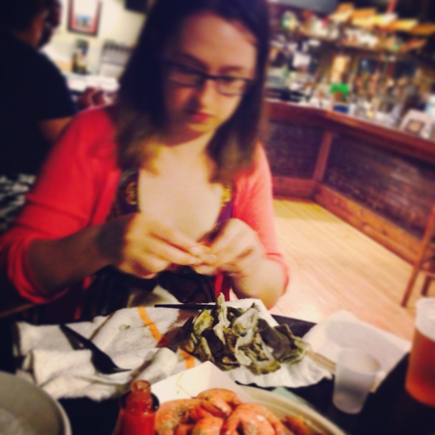 Lastly, an action shot of me hard at work to get my dinner. The place was a bit funky, my elbows were sticking to the table. Regardless, it was so much fun to shuck my own oysters. I will be going back the next time I visit. However, we didn’t get there until almost closing time. I would highly recommend going around sunset time and enjoying a few beers along with your oysters. I don’t know if I would try the all you can eat, but it would certainty be fun to see someone else try!