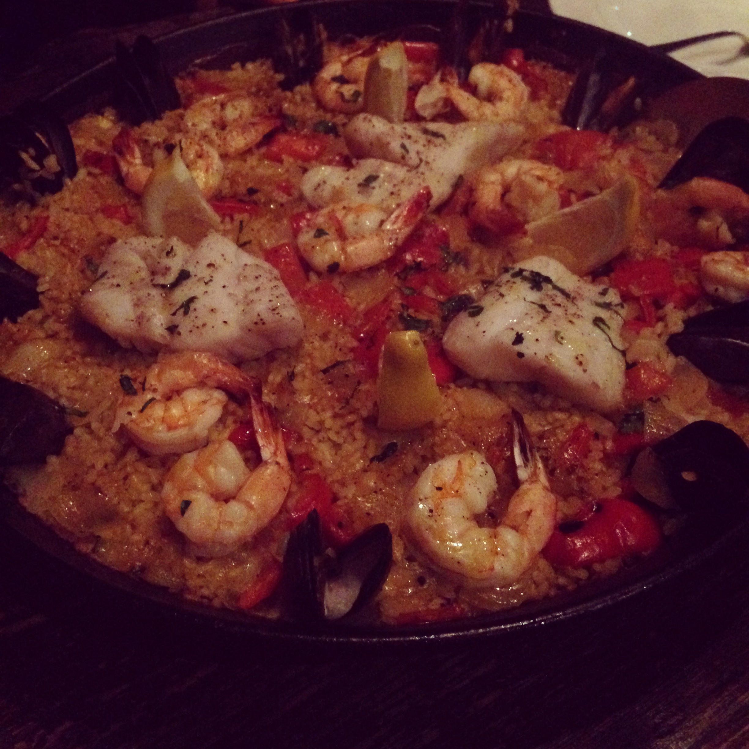 After a sunset cruise through the Charleston Harbor (which I promise I will chronicle soon), the only next logical place to go was out for paella. We were in luck, Charleston has its very own tapas and paella restaurant/bar named Basra. It was located on the very edge of downtown but by no means a far drive from the harbor. The inside of the restaurant was all dark wood, very modern feeling but we decided to sit outside on their lovely patio. Unfortunately, all of the bugs were also on the patio, so we had to move inside. They had a selection of $9 bottles of wine served food until midnight. On that fact alone, I would highly recommend checking them out for late night drinks and eats, which aren’t easy to come by there.