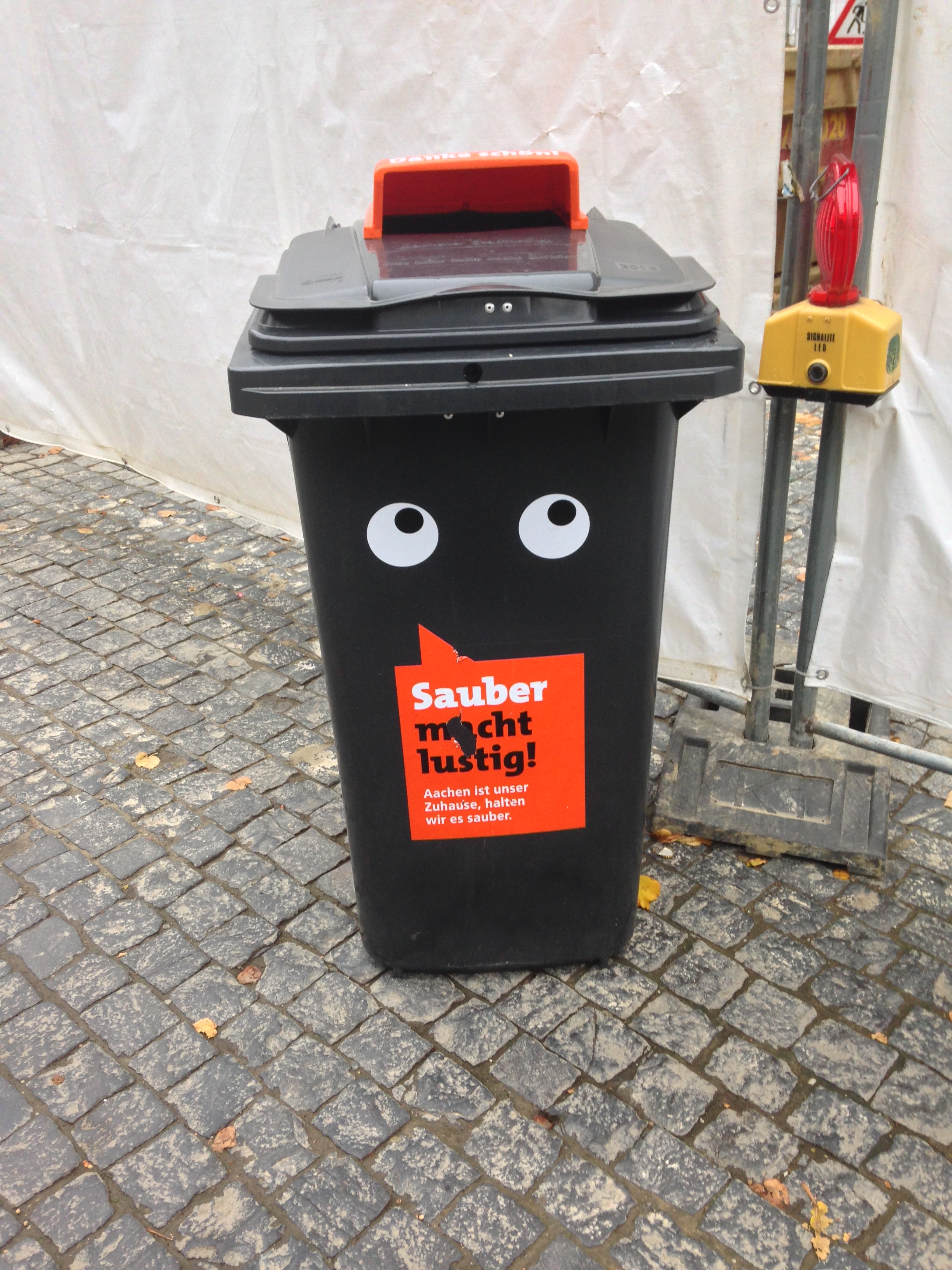 Basically unrelated to my poem, here is a picture of a trashcan in Aachen, Germany. As part of an initiative to get citizens to clean up the town, they starting making talking trashcans. I wasn’t going to throw my garbage on the ground regardless, but I love this little guy! He is telling me how fun cleaning is.