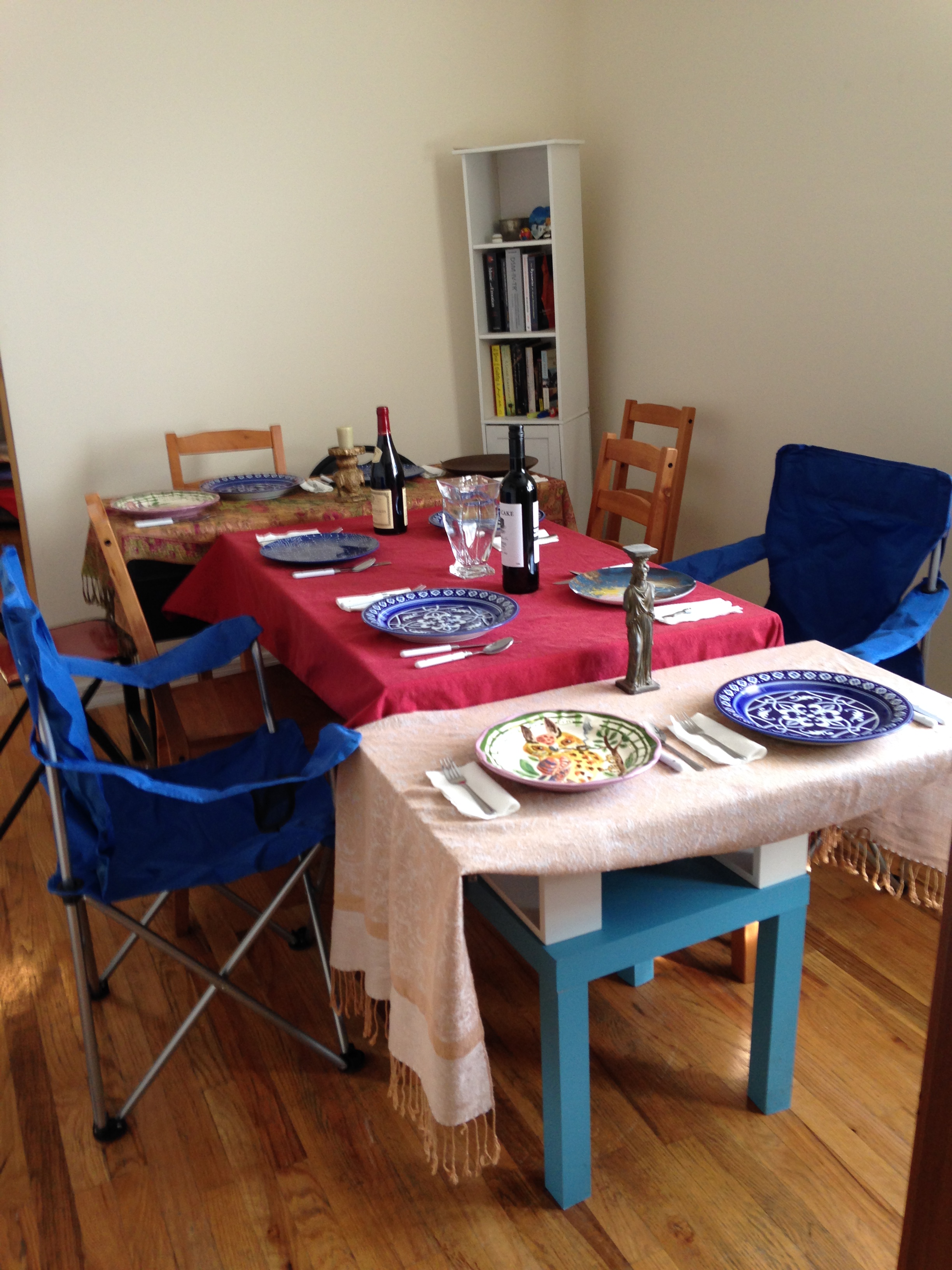 This past winter, I held a dinner party. I managed to make a total Frankenstein’s-monster-esque table. Yes, by the end of the evening I managed to squeeze 13 people into a Brooklyn-sized dinning room. Although, to be fair, that end part wasn’t completely structurally stable. No elbows on the table! None of the flatware or plates matched, but luckily that mismatched look is really in now. When I buy new dishes, I usually keep them in the blue-family to at least coordinate.