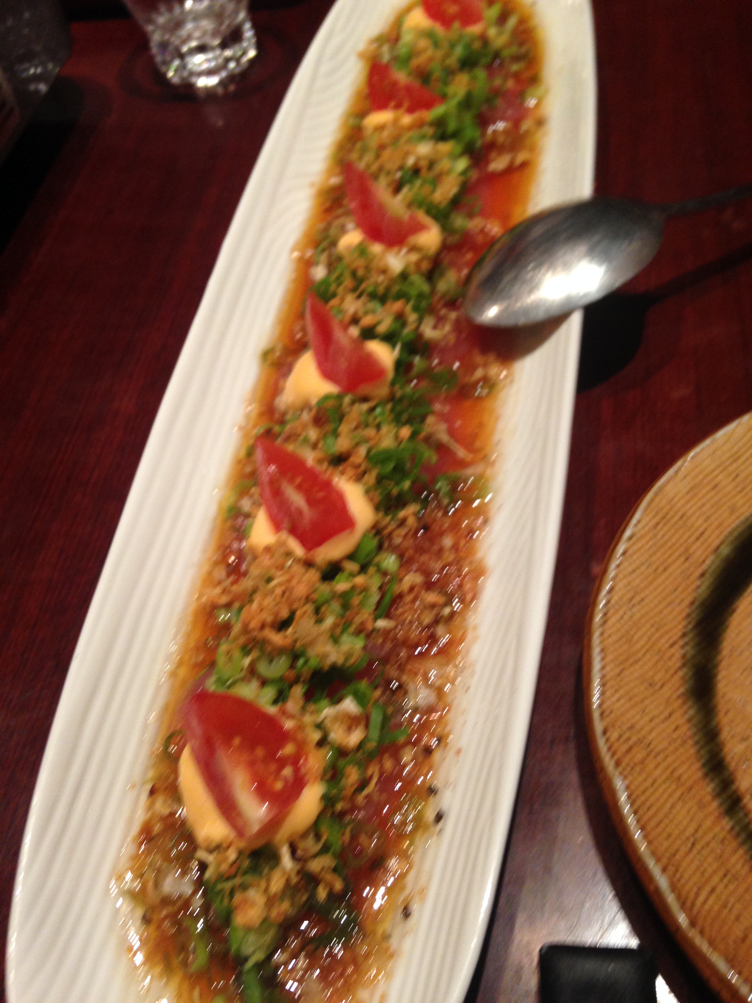 We went a little crazy with the appetizers, but there is nothing wrong with that! First we had the Tuna Carpaccio with scallions, tomatoes, fried garlic chips, and a healthy slab of spicy mayo. It was delicious, not too spicy, plenty of crisp.