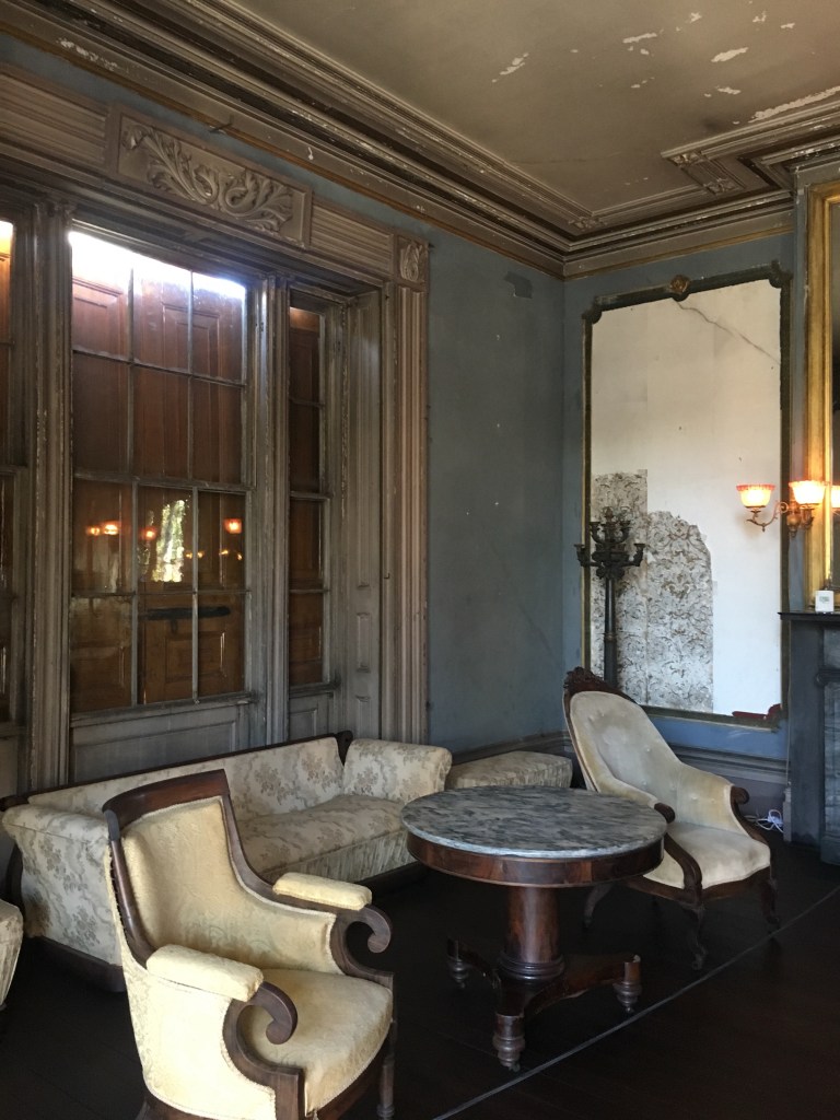 And the adventures in Charleston continue! Late Saturday afternoon, we visited the Akien-Rhett House for a tour of an historic Charleston home. Built in 1820, the Aiken-Rhett House is a preserved antebellum townhouse complete with outbuildings and grounds. What makes this tour unique among other house tours is that it hasn’t been refurbished and repaired, it is kept in a “preserved-as-found” state. The Aiken family lived in the home until the 1970s, but much was left unchanged for the past 100 or so years.