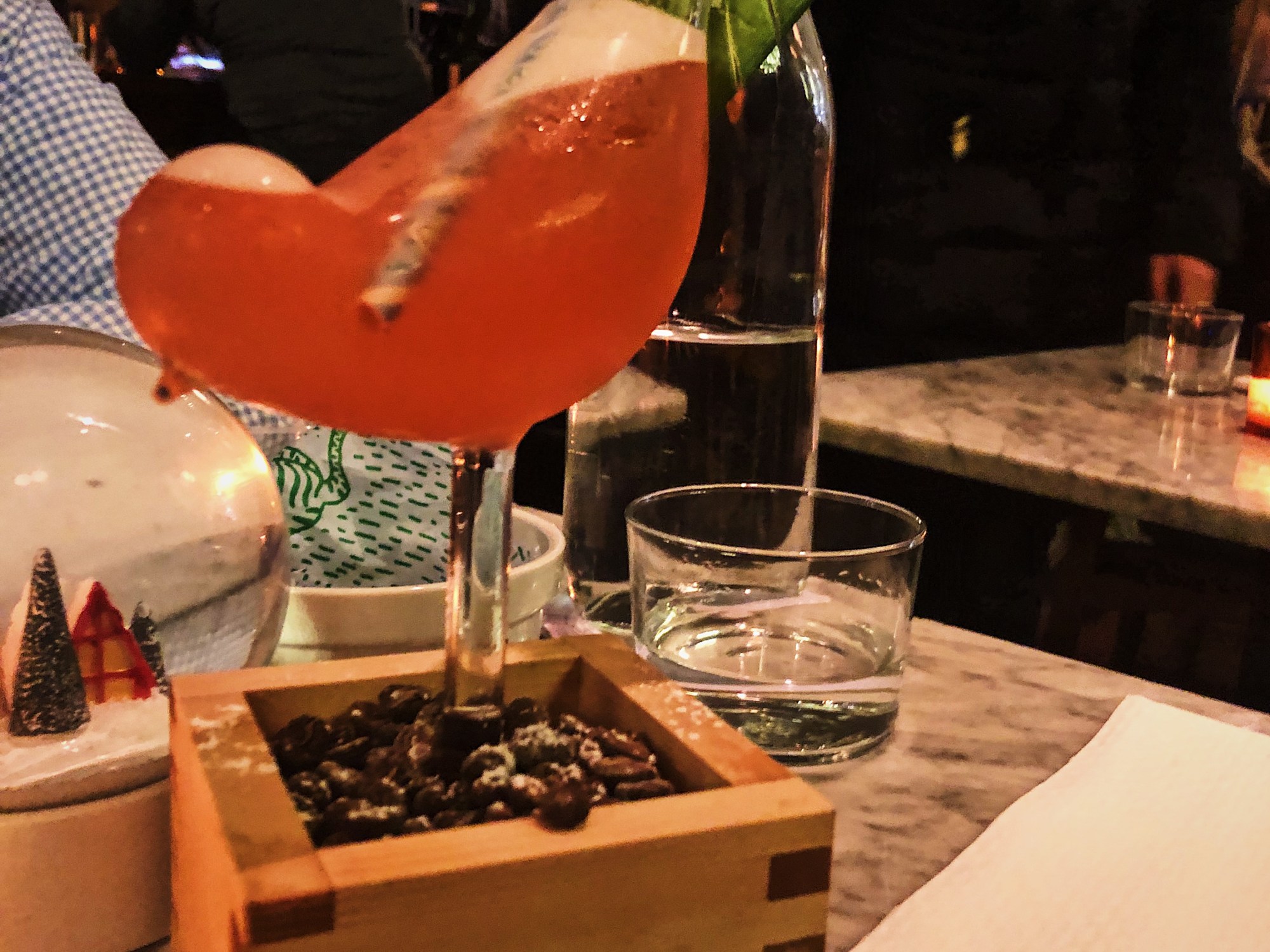 Cocktail hour wouldn’t be complete without some bar snacks. We started out with the winter peanuts which were coated in a thick layer of sumac, black pepper, and cayenne. They were a savory, spicy companion to our drinks.